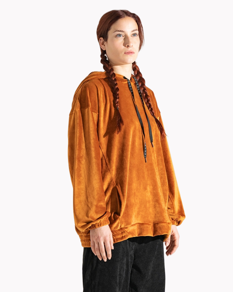 Buzo calce oversize confeccionado con tela plush. De textura afelpada y sumamente suave. Ceñido en la cintura y en los puños. Capucha con ajuste regulable, ojalillos y liston con logo de la marca. 94% poliester, 6% elastano.